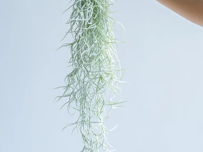 下に伸びるシルバーカラーが魅力的なウスネオイデス。土が不要なエアプランツなので、家具やダクトレールに引っ掛けて気軽に飾れるのがポイントです。直射日光を避けた場所で管理し、霧吹きで水を与えましょう。